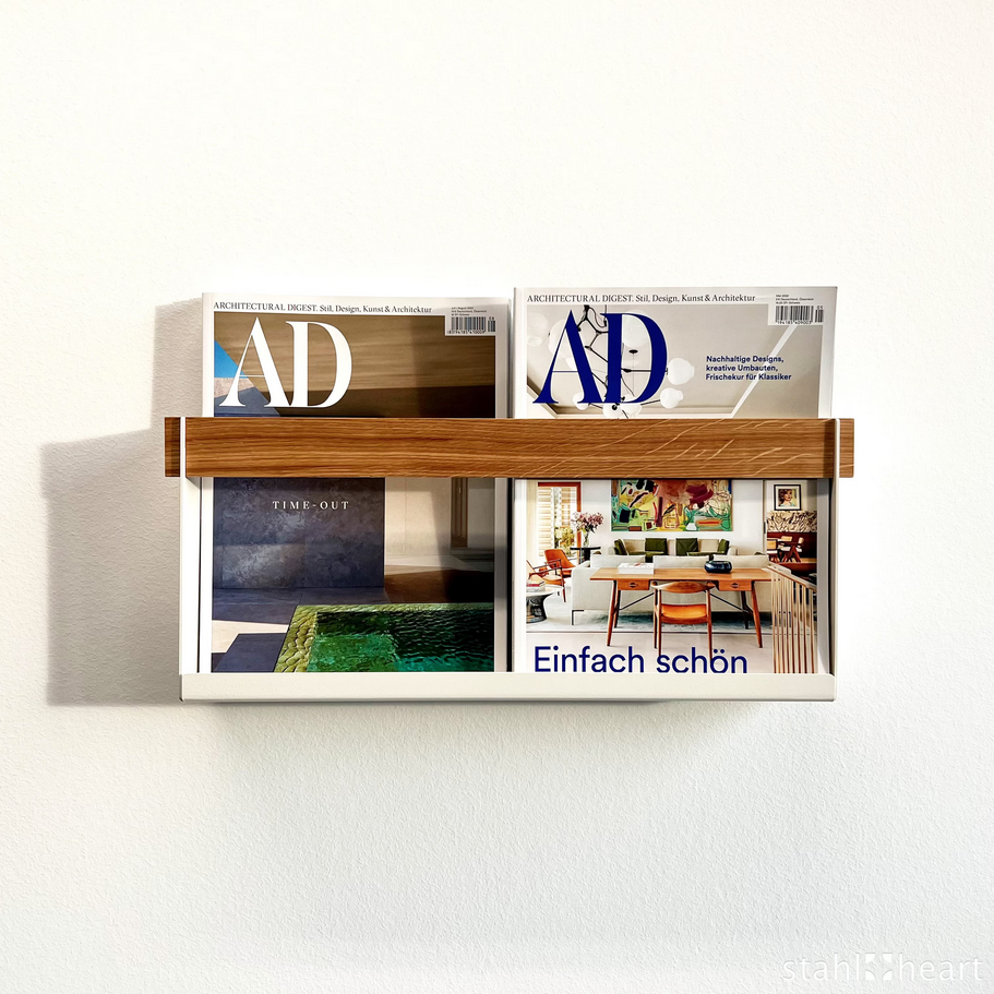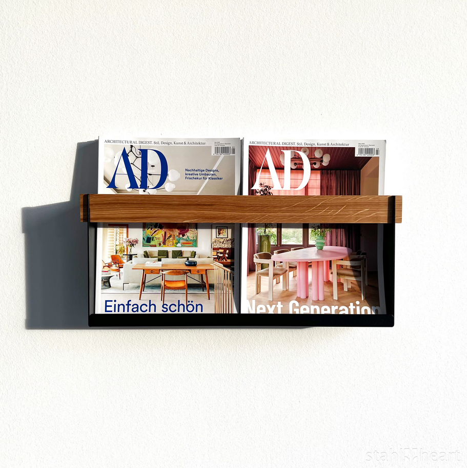Wir bieten 2 Größen an. Das Modell „BS-44“ ist abgestimmt auf das Format A4, somit können 2 Magazine oder Zeitschriften nebeneinander positioniert werden.