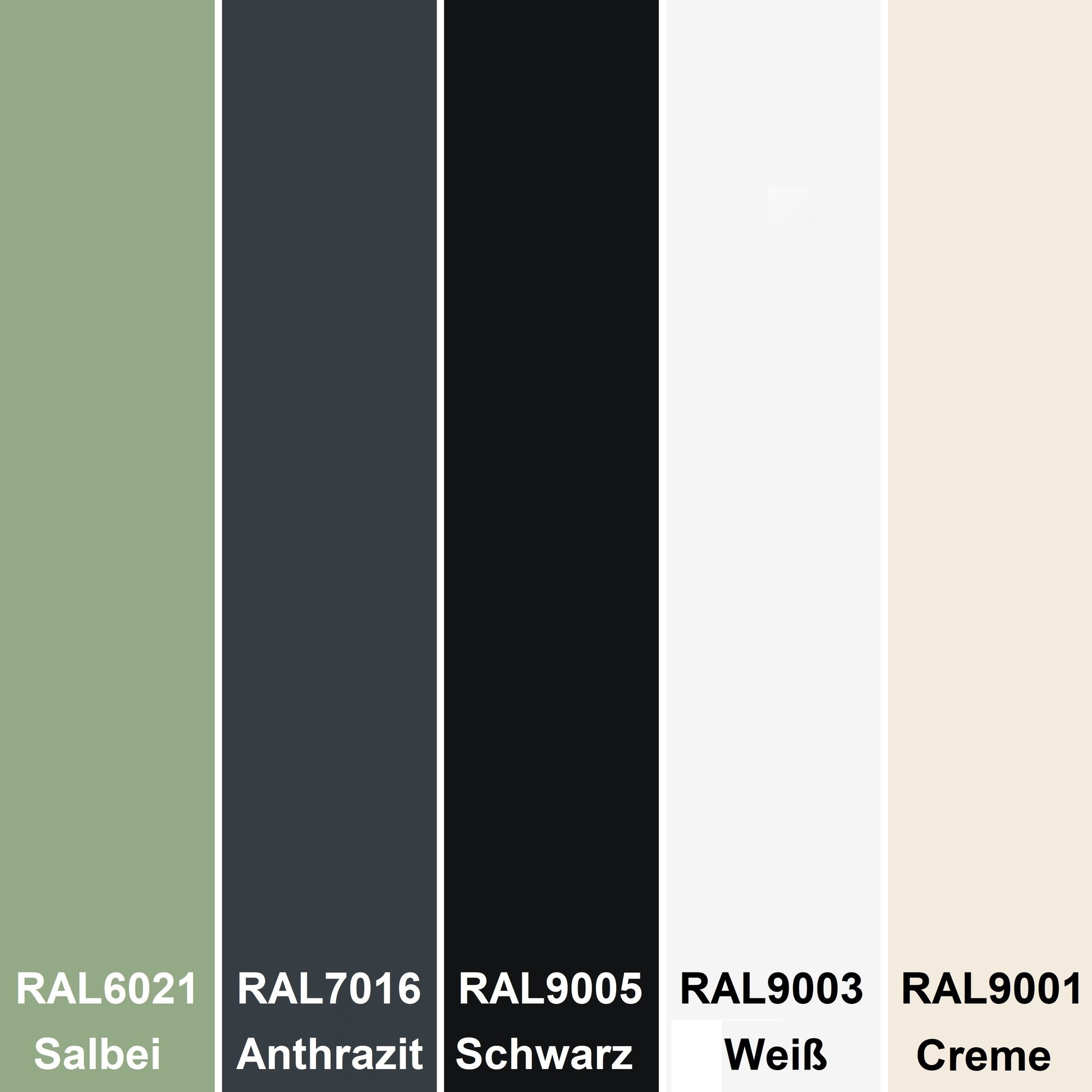Pulverbeschichtung in matter Feinstruktur: Schwarz (RAL9005), Weiß (RAL9003), Creme (RAL9001), Anthrazit (RAL7016), Salbeigrün (RAL6021)